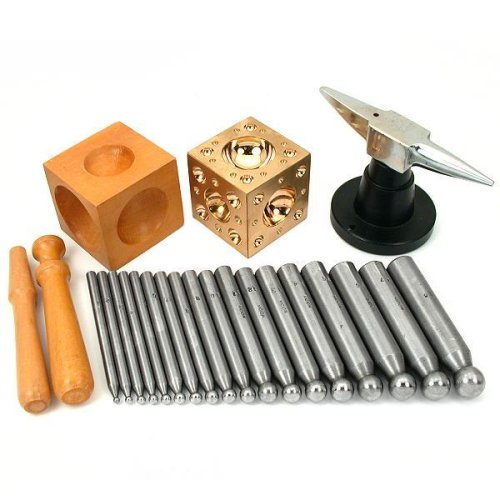 Deluxe Jewelers Punches Dapping Doming Set Of 18 Boxed 18 Steel Dapping Punches. This is a new set of 18 steel dapping punches. Used for shaping, forming and chasing metal in dapping blocks. These are chrome tempered steel and are made of the finest metals that are case hardened. These punches measure approximately 3.52, 4.18, 4.57, 5.06, 5.6, 6, 6.53, 7.05, 7.43, 7.9, 9, 10.12, 10.88, 12, 13.04, 14, 14.93 and 16 mm (0.13", 0.16", 0.17", 0.19", 0.22", 0.23", 0.25", 0.27", 0.29", 0.31", 0.35", 0.39", 0.42", 0.47", 0.51", 0.55", 0.58" and 0.62") 2 Wood Punches & Dapping Block. This is a new wood dapping block with 2 hardwood punches. Great for shaping cases or removing dents. The wood will not scratch or mar precious metals. The depressions measure approximately 29, 29, 35, 36, 43 and 44 mm (1.14", 1.14", 1.37", 1.69" and 1.73"). The block measures approximately 2 1/4" x 2 1/4" x 2 1/4" (57 x 57 x 57 mm) Double Horn Anvil. This is a new double horn anvil. Has a round base with a stainless steel anvil with horn. This is a great tool for forming and shaping metal. Great for silversmith or blacksmith planishing and anyone who uses a anvil or staking tools. The top measures approximately 5 3/16" x 13/16" (132 x 21 mm) Brass Dapping Block. This is a new brass dapping block. The depressions have a smooth finish that are great for shaping metal. The half spheres are precision machined and hardened to perfection.
